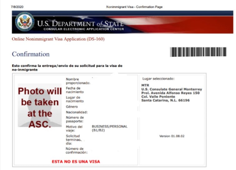 Este documento siempre tendrá en la parte superior derecha un código de barras y bajo este un código de letras que servirá como identificador de tu formulario DS-160, generalmente es alfanumérico y empieza con dos letras AA mayúsculas y otros números.