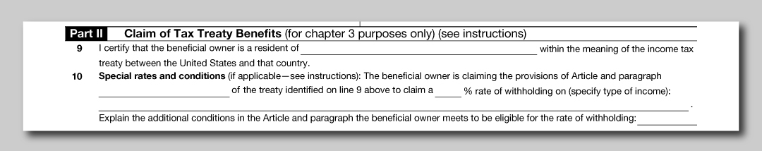 En los puntos 9 y 10 deberás completar en el caso de solicitar beneficios tributarios por tratado entre EE. UU y su país de residencia.