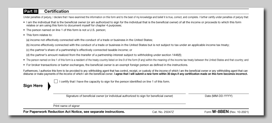 El formulario W8-BEN se divide en tres partes las cuales son: