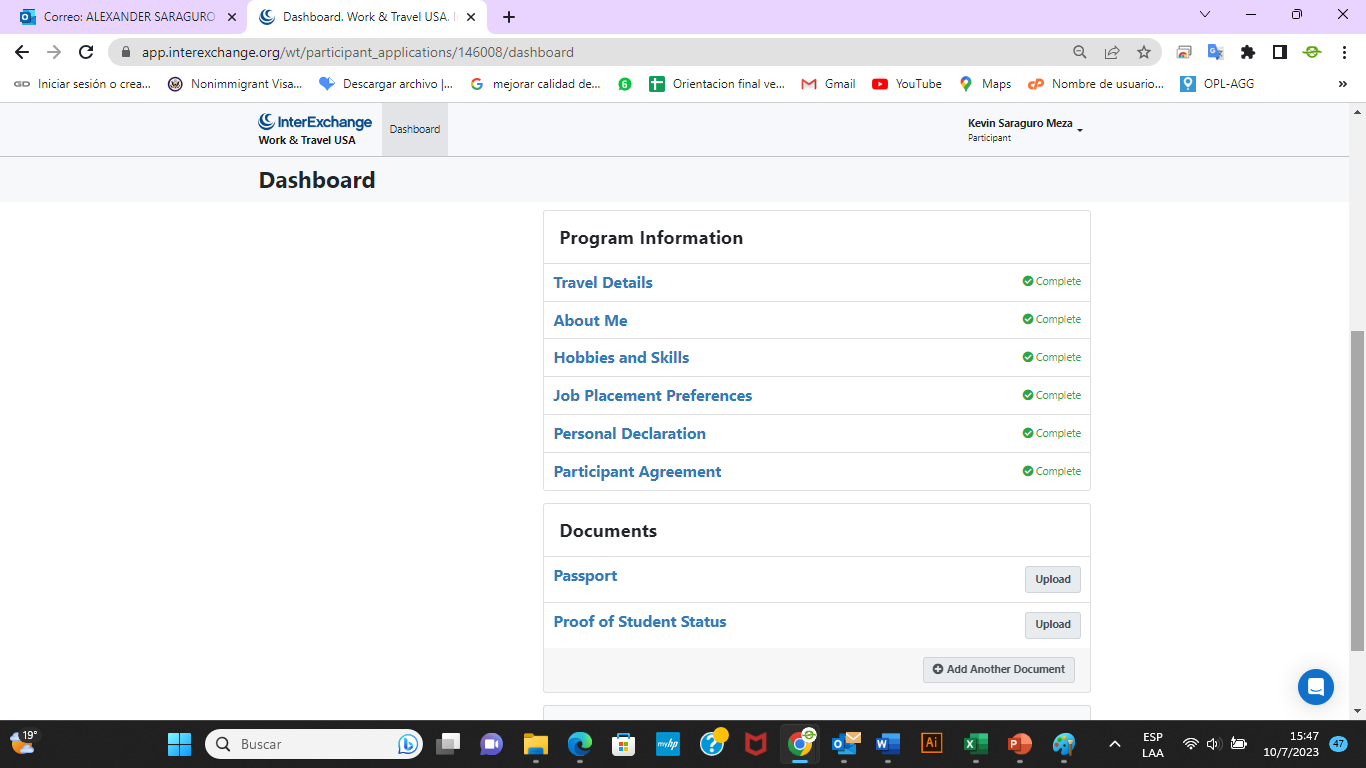 5.- En la sección de Documentos, deberás cargar tu pasaporte vigente y un certificado de estudios universitarios en inglés.