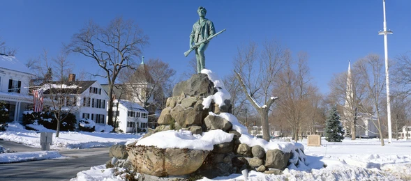 Al noroeste de Boston se encuentra Lexington, donde los primeros disparos de la Guerra de la Independencia tuvieron lugar el 19 de abril de 1775. A Estatua de Minuteman por el escultor Henry Hudson Kitson y una marca de monumento Battle Green.